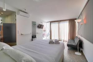 Each room features a flat-screen satellite TV, a fridge, and a private bathroom equipped with a shower, hairdryer, shampoo, and hot tub. Guests can relax on the terrace or enjoy seating areas that include sofas and desks. The building has elevator access to upper floors and tiled or marble flooring throughout.