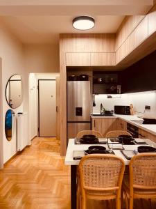 В апартаментах предусмотрена полностью оборудованная кухня, включающая посудомоечную машину, кофемашину, электрический чайник и заварочный набор. Гостиная зона оснащена удобной мебелью и телевизором с плоским экраном и доступом к стриминговым сервисам. В ванной комнате имеется выбор между ванной или душевой кабиной, а также предоставляются шампунь, постельное бельё и полотенца для комфорта гостей.