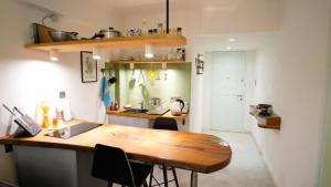 L’appartement se compose d’une chambre, d’une kitchenette entièrement équipée et d’une salle de bains privative. Les hôtes disposent d’un accès direct à la terrasse qui relie l’espace intérieur au jardin extérieur.