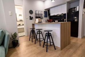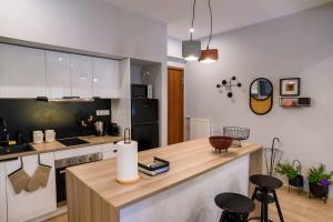 Apartmán se nachází v Athénách, pouhých 1,5 km od Kulturního centra Nadace Stavrose Niarchose. Tento útulný a současný luxusní městský retreat nabízí ubytování s balkonem s výhledem na město a klidnou ulici.