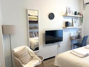 The apartment includes one bedroom and a fully equipped kitchen featuring a microwave and fridge. Guests can use the washing machine and enjoy access to a private bathroom fitted with a hairdryer, soap, and shampoo. The living space contains a flat-screen TV, an iron, heating for colder weather, and linens including towels.