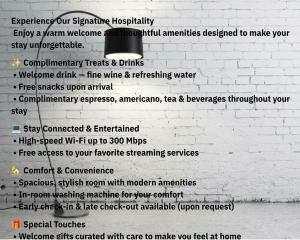 Апартаменты оснащены двумя спальнями и двумя ванными комнатами с душевыми кабинами и ваннами. Для гостей предусмотрена полностью оборудованная кухня с плитой и микроволновой печью, а также столовая зона и гостиная с плоскоэкранным телевизором, поддерживающим стриминговые сервисы, игровыми консолями Nintendo Wii и Xbox One, Blu-ray плеером и кабельными каналами. Помещения звукоизолированы и гипоаллергенны, полы выполнены из натурального дерева. В ванной комнате имеются полотенца, постельное белье и антисептик для рук. Для хранения ценных вещей предоставлен сейф.