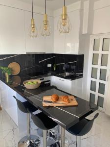 The spacious one-bedroom apartment includes a living room with a flat-screen TV and an equipped kitchen featuring an oven, toaster, refrigerator, coffee machine, tea maker, and electric kettle. The bathroom contains both a bathtub and essential toiletries like soap and shampoo. Guests can enjoy meals outdoors on the terrace’s dining area while appreciating the surrounding cityscape.