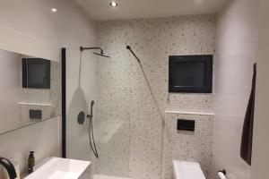 El baño cuenta con ducha además de artículos como jabón y champú. Entre las comodidades adicionales se incluyen ropa de cama, toallas, tendedero para ropa y suelo parquet. Este apartamento para no fumadores también ofrece un comedor para mayor comodidad de los huéspedes.