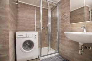 The spacious apartment includes two separate bedrooms and two bathrooms with either a bathtub or shower and a hairdryer. The fully equipped kitchen contains an oven, stovetop, dining area, coffee machine, and washing machine for added convenience. The living room offers a sofa and flat-screen TV for relaxation.