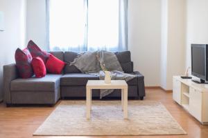 The apartment features one separate bedroom alongside a living area furnished with a sofa and seating space. Guests have access to a fully equipped kitchen, while the bathroom contains towels, shampoo, and a shower. Additional conveniences include an iron, washing machine, clothes rack, desk, and linens for the beds.