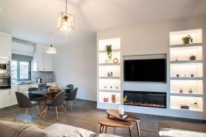 Cet appartement spacieux se compose de trois chambres et deux salles de bains équipées d’un jacuzzi. Il dispose également d’un espace salon ouvert avec cheminée et télévision à écran plat, ainsi que d’une cuisine équipée avec lave-vaisselle, four, machine à café, micro-ondes et bouilloire électrique. Les hôtes peuvent profiter du mobilier extérieur sur la terrasse ou accéder au balcon pour apprécier le panorama environnant.